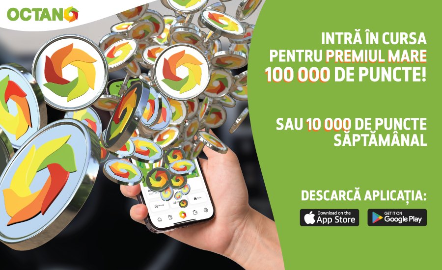 Tot ce trebuie să faci este să instalezi aplicația OCTANO și să te înrolezi cu cardul de puncte existent sau să îți faci unul nou. Ești automat înscris în tombolă! În fiecare săptămână poți câștiga 10.000 de puncte, iar la final, marele premiu de 100.000 de puncte!